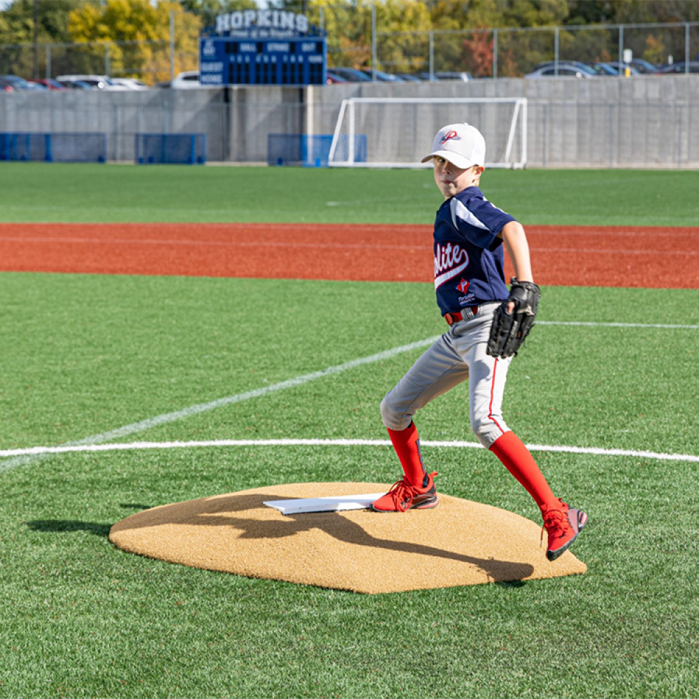 Measuring in at 6” H x 5’ W x 6’ L, this mound is perfect for 13 and under! This mound has tapered edges for a smooth transition, durable wear pad for many seasons of use, and high quality turf in multiple color options! The weight is only 60 lbs, making this easily portable on any field!