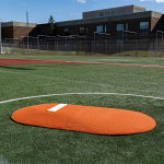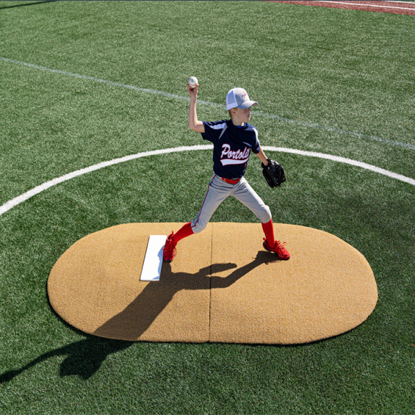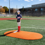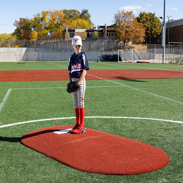 Measuring in at 6” H x 5’ W x 8’11” L, this mound is perfect for 14 and under! This mound has tapered edges for a smooth transition, durable wear pad for many seasons of use, and high quality turf in multiple color options! The weight is 60 lbs each section, making this easily portable on any field!