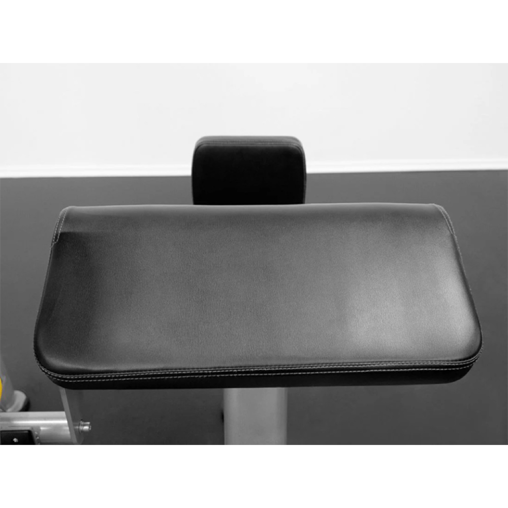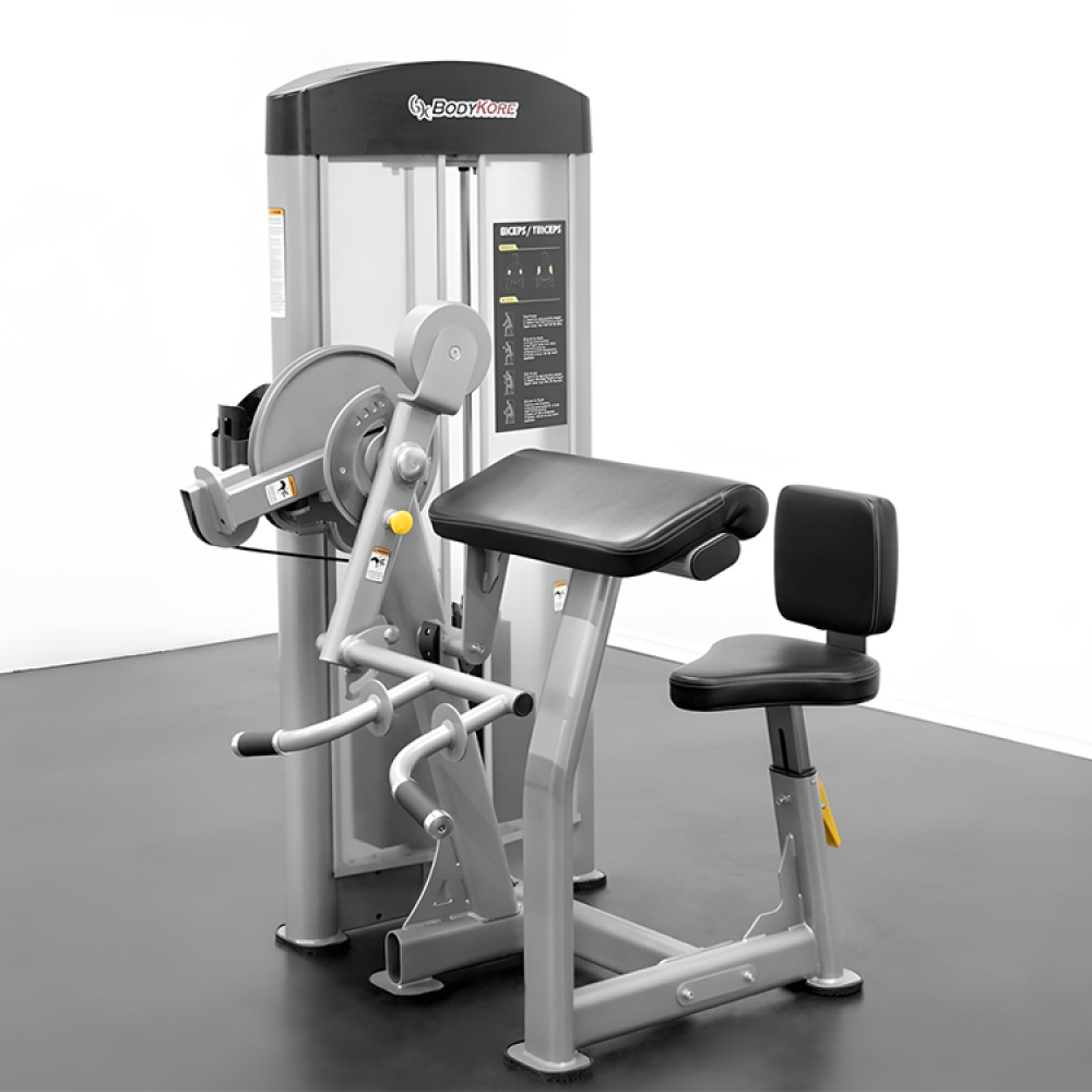 The BodyKore Bicep Curl and Tricep Extension Combo Machine is positioned at a 30 degree angle for precise biomechanical movement! The intelligent dual function design allows you to target the biceps or triceps with a simple rotating arm to change the movements! Fit users of any size and eliminate unwanted shoulder movements with the extra wide arm pad! Adjustable seat and back support is available in (6) positions which allows users a comfortable, stable platform to help isolate movement! The (3) position multi-grip handles reduce torque and provide continuous resistance around a natural arc! This unit comes with a lifetime warranty on the frame!