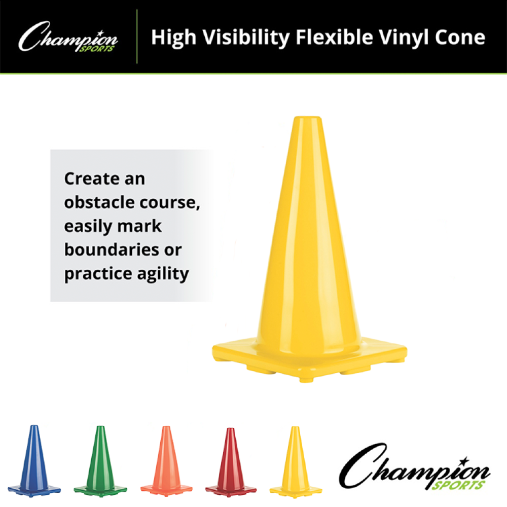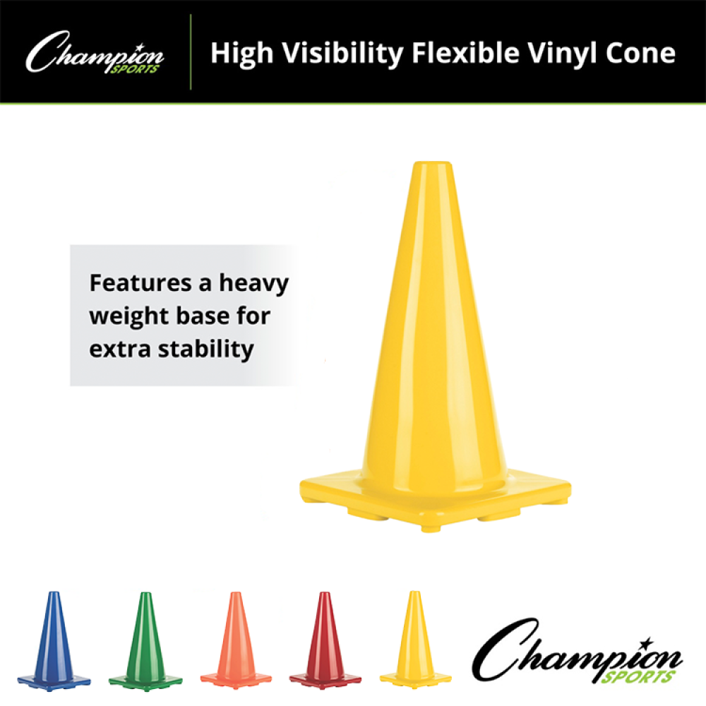 Our Champion Sports High Visibility Flexible Vinyl Cones can be used for a variety of activities and sports! These durable cones are made of flexible vinyl in single-piece construction and feature a weighted bottom for added stability! Whether you're training for a specific sport or simply looking to improve your overall athleticism, these cones are a great addition to your training equipment!