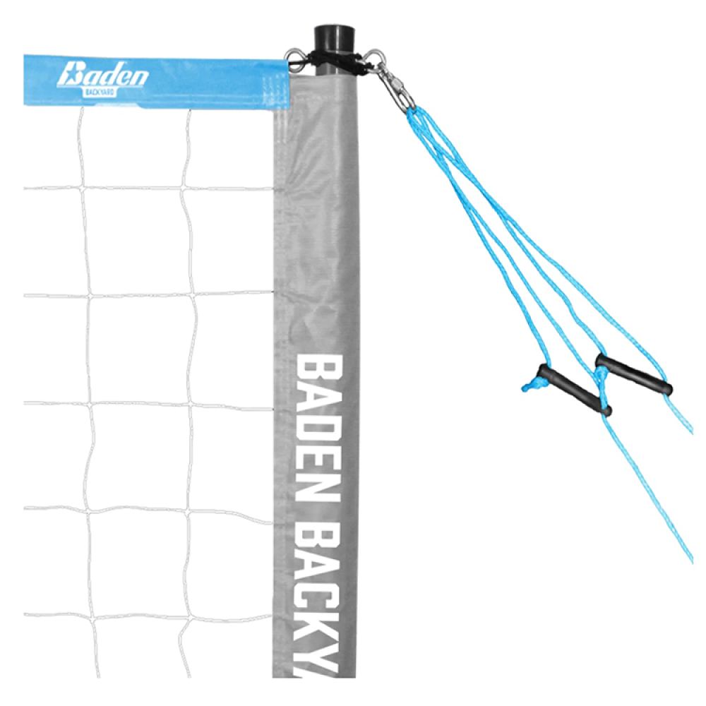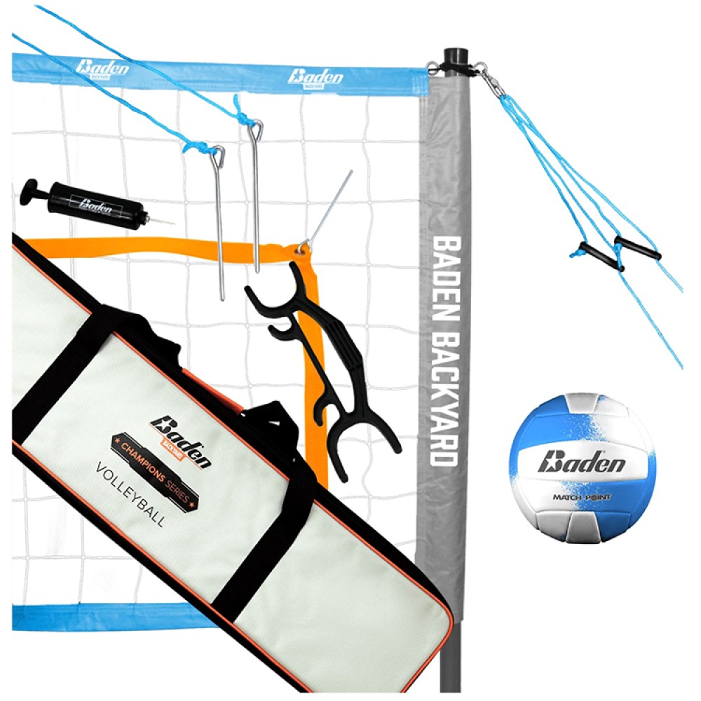 This product comes with (1) Regulation Size Volleyball Net, (1) Baden Match Point Volleyball, (1) Ball Pump with Needle, (2) Heavy Duty Steel Poles, (2) Guy Lines with Quick Tension Pulldown Handles, 10" Stakes, 30' x 60' Boundary Lines, and (1) Storage Bag!