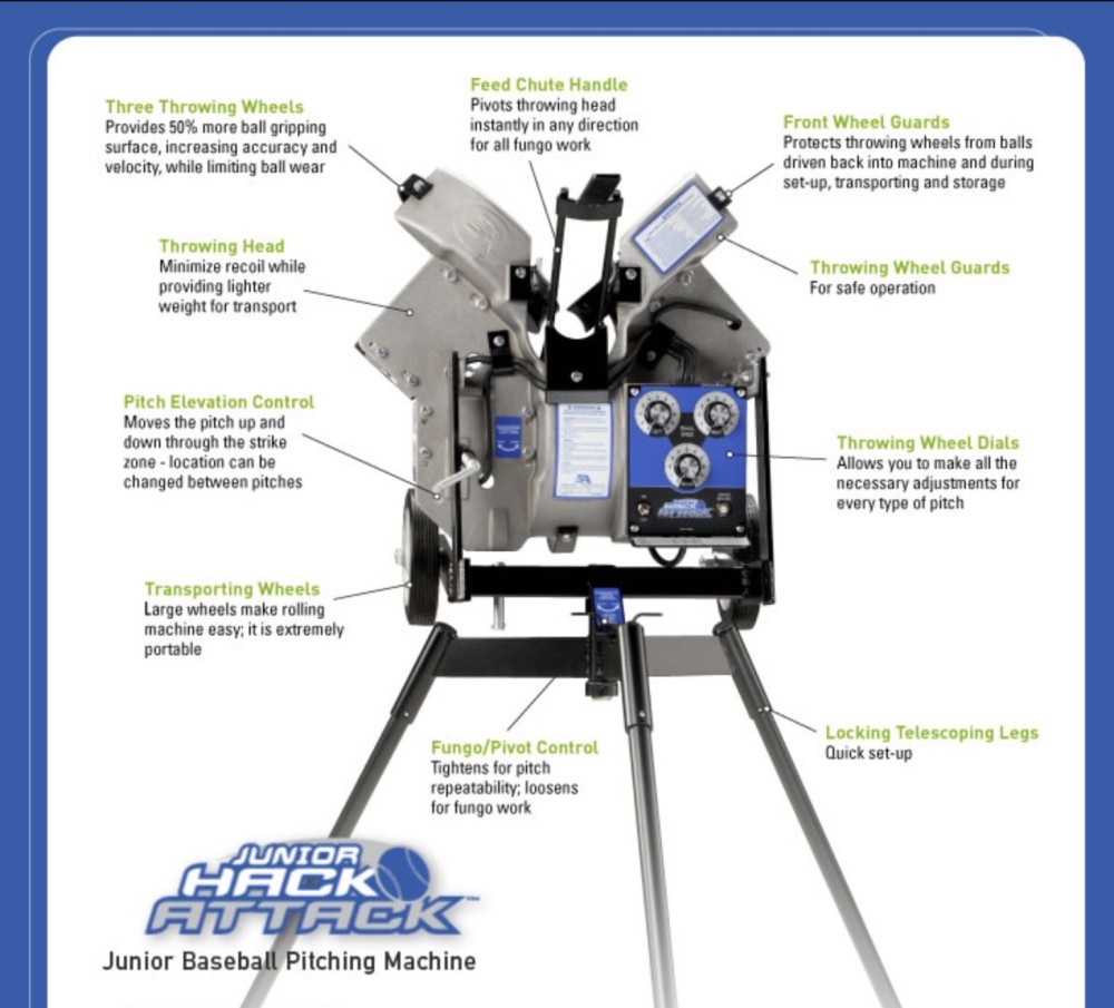 The Jr. Hack Attack Pitching Machine is designed for developing serious athletes! The unique 3 wheel design allows hitters to easily see the ball enter the machine, allowing for better timing and vision! This machine is easily able to throw high velocity fastballs in addition to a plethora of off-speed pitches! The throwing head is able to pivot horizontally and vertically to hit any part of the strike zone! This machine is able to be used both for hitting and as a fungo for defensive work (fly balls, ground balls, etc)!