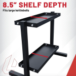 Our Lifeline Kettlebell Storage Racks are made of heavy gauge steel, ensuring longevity and durability! With a high capacity of 500 lbs, you can store small or large kettlebells on the (2) 21" W x 8.5" D shelves! Keep your space organized and maintain a sleek look in your commercial or residential gym! Available in single or double racks!