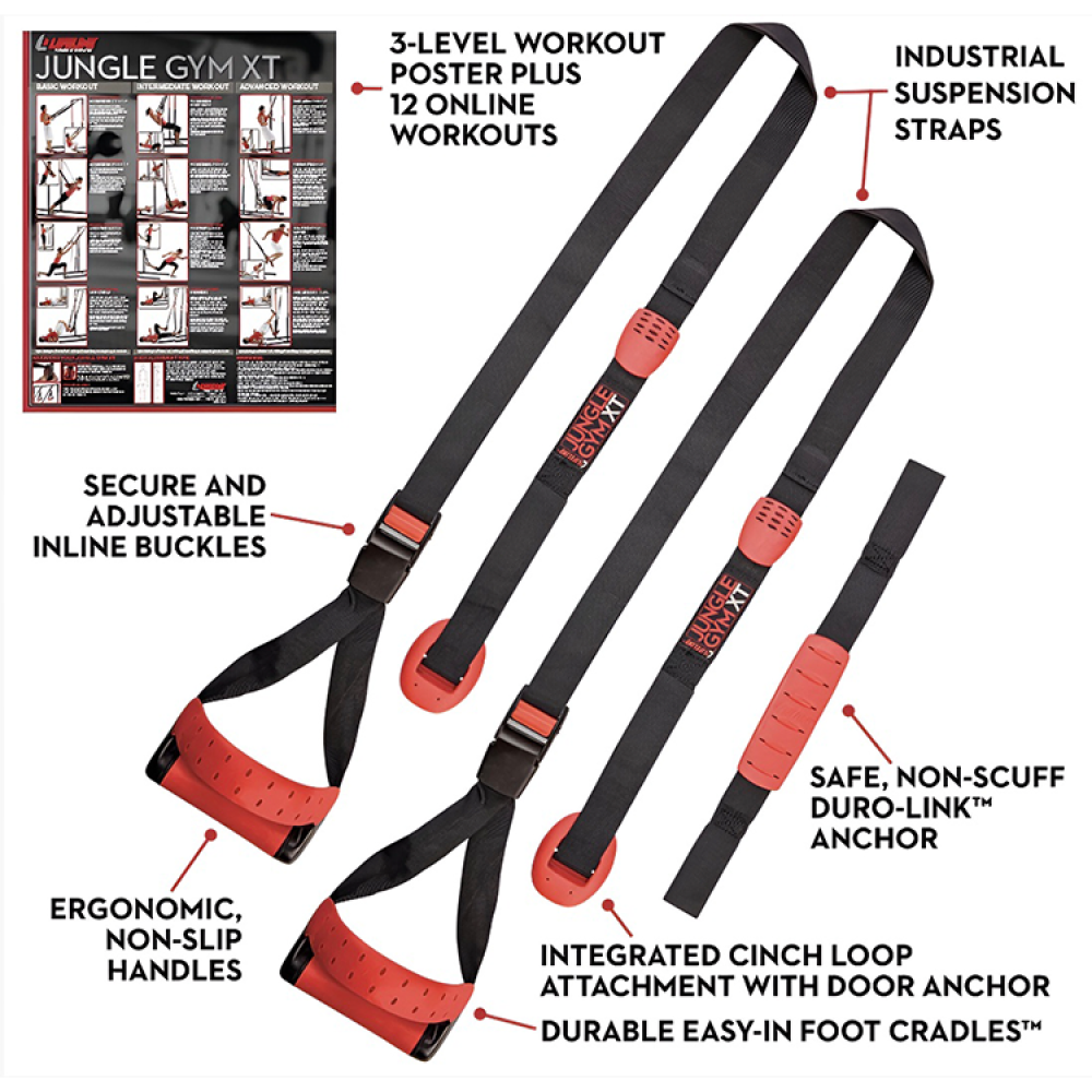 Take your suspension training to the next level with our Lifeline Jungle Gym XT! Featuring a flexible split anchor design, these can be attached basically anywhere! These are highly durable and are built to punish commercial use! The adjustable inline buckles allow the user to rapidly switch the strap length for high and low exercises! Lifeline Jungle Gym XT is great for all ages, from beginners to professional athletes! Simply change the resistance level by changing your body positioning to decrease or increase gravity! The large, full color workout chart and downloadable instruction video provides great workouts for users of all heights and fitness levels!