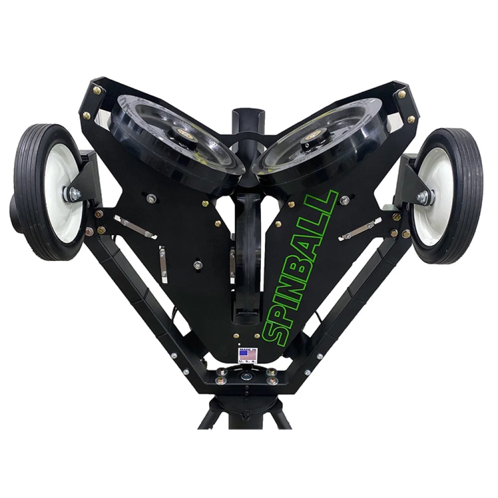 The Spinball Three Wheel Pitching Machine is one of the best pitching machines on the market, used by top training facilities, dozens of D1 Universities, and 28 teams in the MLB!  The unique 3 wheel design allows hitters to easily see the ball enter the machine, allowing for better timing and vision!  The new and improved gearboxes allow users to easily set the pitch speed and type!  Spinball’s solid wheels feature a 1” thick urethane tread providing lower shock loads and almost instant speed recovery!  With speeds ranging from 40-100 mph for baseball and 35-75 mph for softball, this machine ensures great batting practice for any skill level!  The throwing head is able to pivot horizontally and vertically to hit any part of the strike zone!  This machine is able to be used both for hitting and as a fungo for defensive work (fly balls, ground balls, etc)!