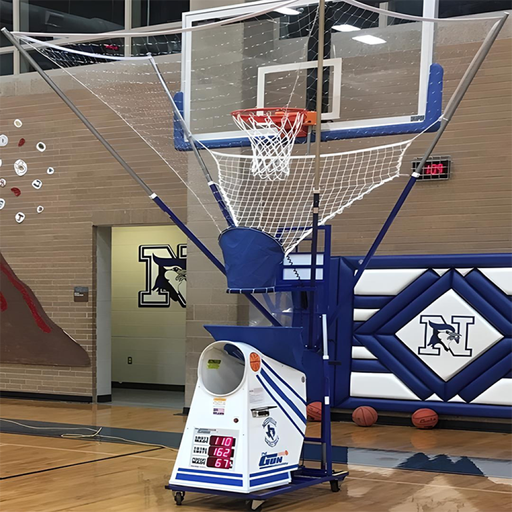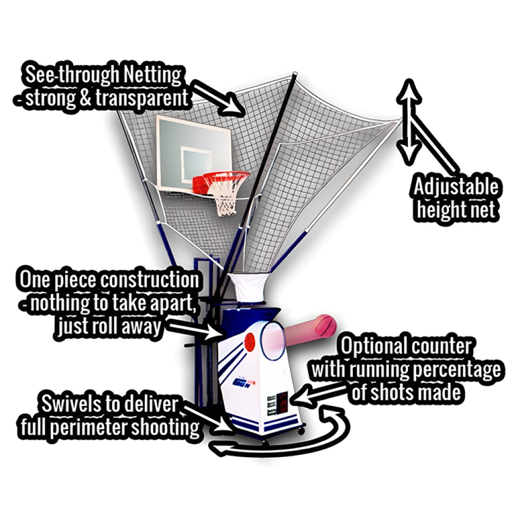 The Gun 6000 by Shoot-A-Way is a basketball shooting machine to dramatically improve a player’s shot! This machine has the capability to provide up to 1,800 shots per hour and can rotate 180 degrees to hit any spot on the perimeter! The time delay function allows players to practice shooting off the move with game-like intensity! An adjustable collection net can move from heights ranging between 11’ and 14’, allowing players to practice obtaining the perfect arch on their shots! Setup takes only 30 seconds and once you are done practicing, you can simply roll the single unit into storage! You can customize this product in your team colors with a logo on each side!